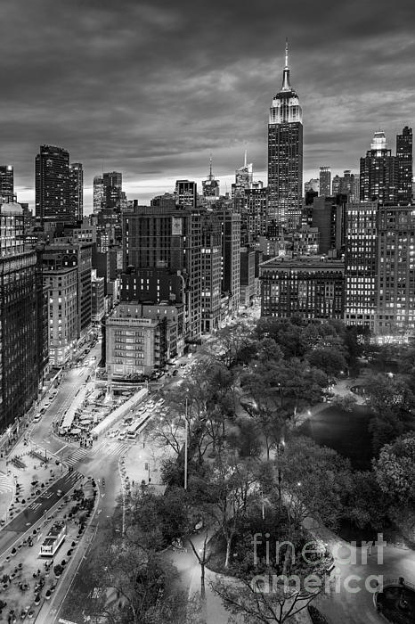 An upper view to the Flatiron District along with Fifth Avenue and Broadway with the Empire State Building illuminated in Red and White in honor of Coty Inc, and the 8th annual DKMS Gala. The Flatiron District Birds Eye View photograph is also available as a color print.