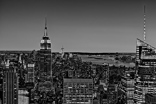 A black and white view to the New York City skyline from Top of The Rock at Rockefeller Center in New York City.