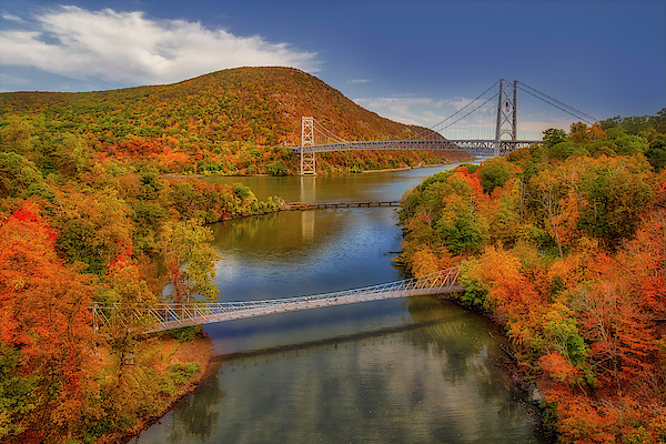 Autumn At Bear Mountain Bridge - Looking south at Bear Mountain Bridge, CSX railroad tracks bridge over the Hudson River and Popolopen footbridge during autumn with its magnificent vibrant foliage.