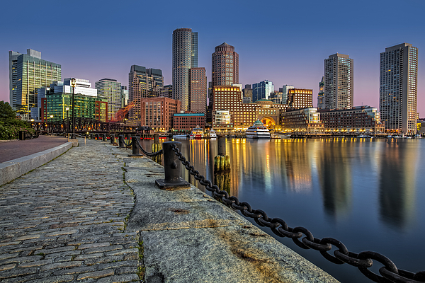 Boston Skyline Dawn - Fan Pier Boston Harbor - A view during twilight as the sun begins to rise to the Boston Harbor with the Boston Financial... more