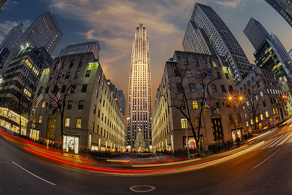 A fish eye view during sunset to Rockefeller Center with the decorated and illuminated iconic Christmas Tree.