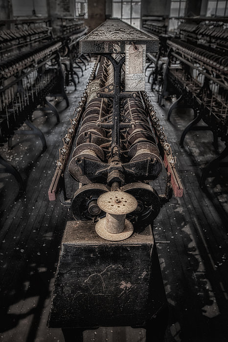 An empty spool sits at the end of one of the industrial machines at the last standing Silk Mill in the US located in Lonaconing, Maryland.