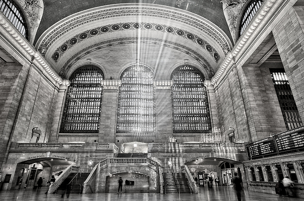 New York City's Grand Central Terminal Station in black and white with light beams coming in thru the window.