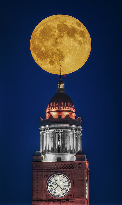 An incredible view as the massive, Harvest Supermoon seems to balance perfectly atop the spire of the historic old Inquirer building clock tower.