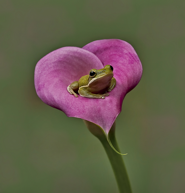 A cute green tree frog resting on top of a Pink Calla Lily Flower with a soft green background.