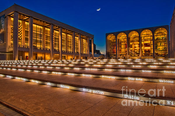 Lincoln Center for the Performing Arts at twilight with the crescent moon rising. The David H. Koch Theatre building at left and the Metropolitan Opera House. The stairs are illuminated at night with the word welcome in every language.