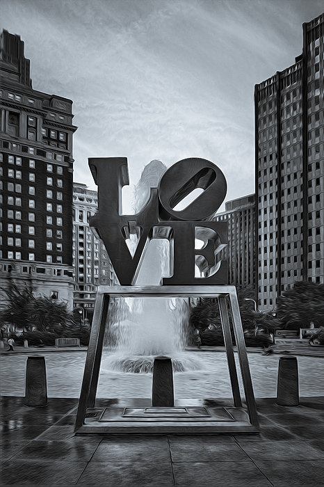 Black and White, digitally enhanced view to the Love Sculpture with the water fountain in the background of Love Park in Philadelphia, Pennsylvania.