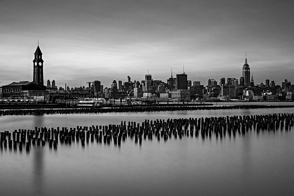 The New York City skyline along with Empire State Building illuminated in pastel colors and the Erie Lackawanna Terminal in Hoboken, New Jersey during the magical sunset hour. Also available in a color version print.