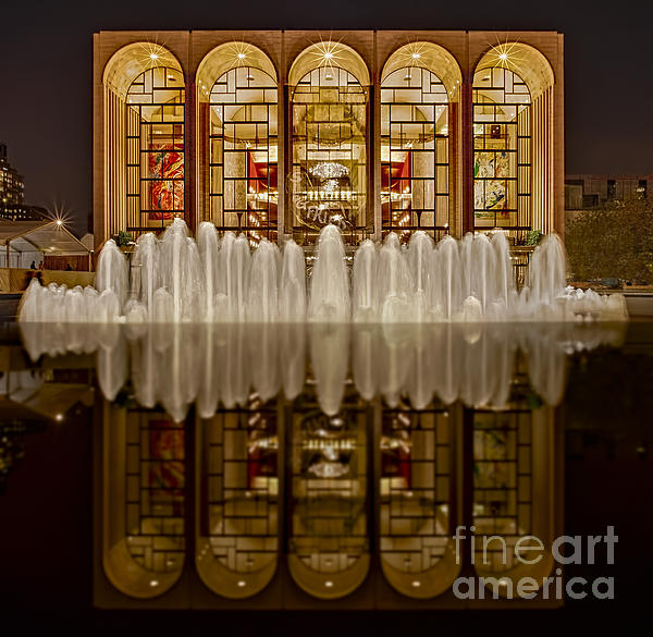 An evening view of The Metropolitan Opera House, which is located in the center of the Lincoln Center Plaza in New York City. The Opera House and the Revson fountain is reflected off the black granite that forms a ring around the Fountain.