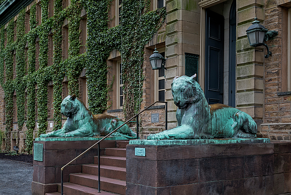 The main entrance is guarded by the Princeton Tiger statue pair with one at each side.