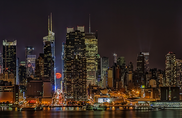 NYC Super Moon Rising - The Super Moon rises over 42nd Street in Times Square Manhattan to make it's way over the New York City Skyline.