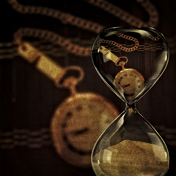 Timepieces - Antique stopwatch refleccted through a sandglass with a textured vintage background.