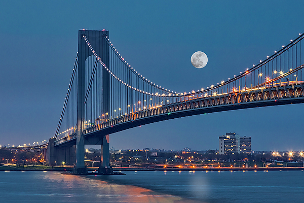 Verrazano Narrows Bridge Moon - View to Verrazano Narrows Bridge, the New York Harbor under a full moon during the blue hour at twilight.